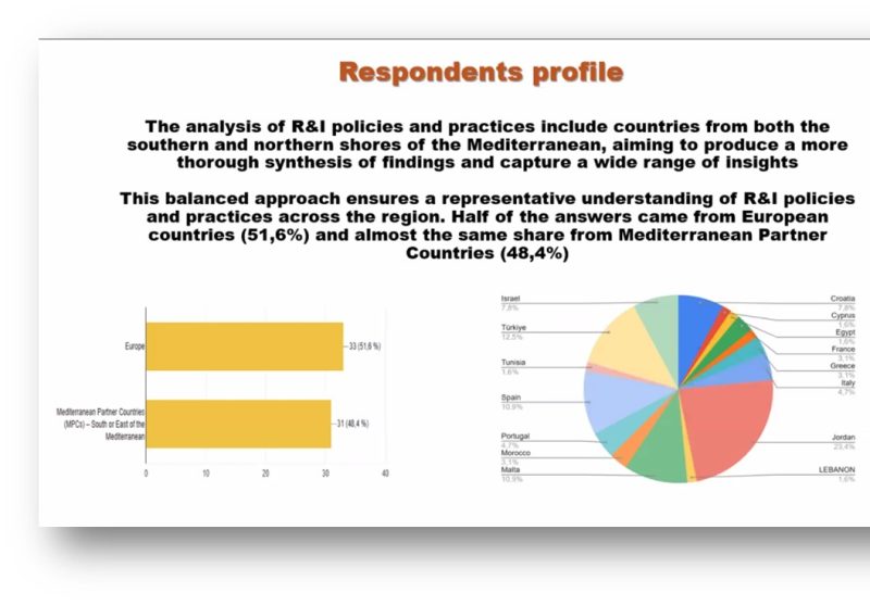 The survey collected input from both shores of the Mediterranean, with contributions almost evenly split between European countries (52%) and Mediterranean Partner Countries (48%). Strong participation came from Jordan (23%), Turkey (13%), as well as Spain, Morocco, Tunisia, and Portugal — ensuring diverse insights into regional R&I practices.